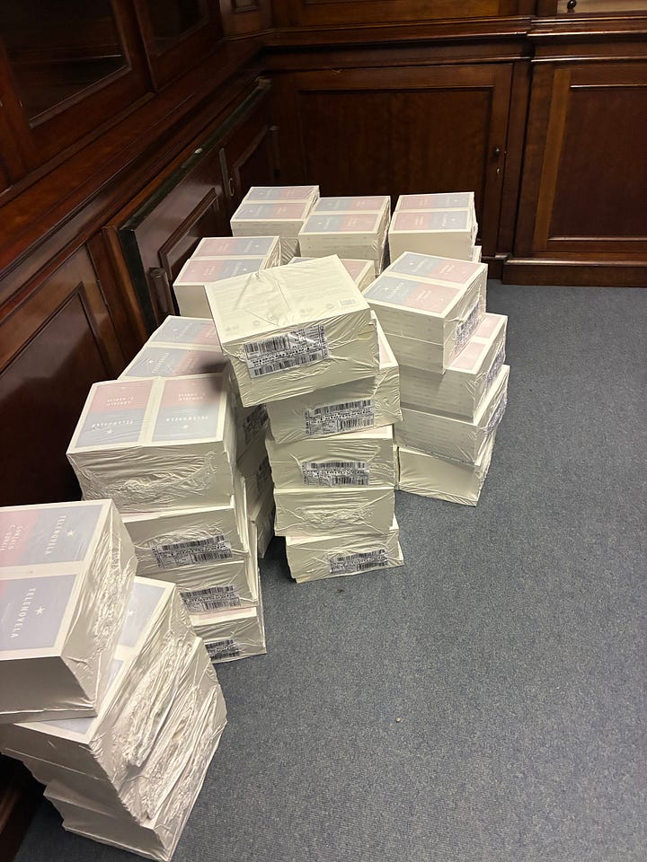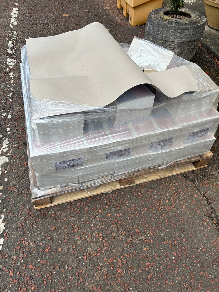 The books arrived on a lorry and - and this is one of the real privileges of being an independent publisher - I got to carry hundreds of them with my own hands, down some stairs, into the room we’ve hired, generating plenty of sweat on my own brow.