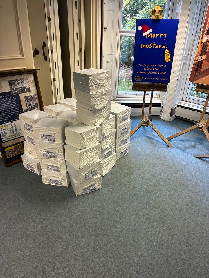 Physical copies arrived a few days ago. Most were sent to our distributor Turnaround, ready to hit the shops by publication date on 26 November. But quite a few were also delivered on to a place in Norwich called Carrow House, which used to belong to the mustard magnate Jeremiah Colman (hence the mustard box you can see in that photo) and now houses a wonderful array of charities - and, for a few weeks, Galley Beggar Press.